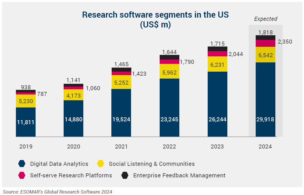 The US research software market experienced notable growth between 2019 and 2023, mainly driven by digital data analytics. This segment grew by 12.9% between 2022 and 2023, reaching US$26.2 billion in 2023, compared to US$11.8 billion in 2019. Representing 72% of the total US market in 2023, digital data analytics’ dominance highlights the industry’s focus on leveraging advanced data tools for strategic decisions. This reliance on data-driven insights will likely continue, with organisations seeking more sophisticated analytics capabilities.