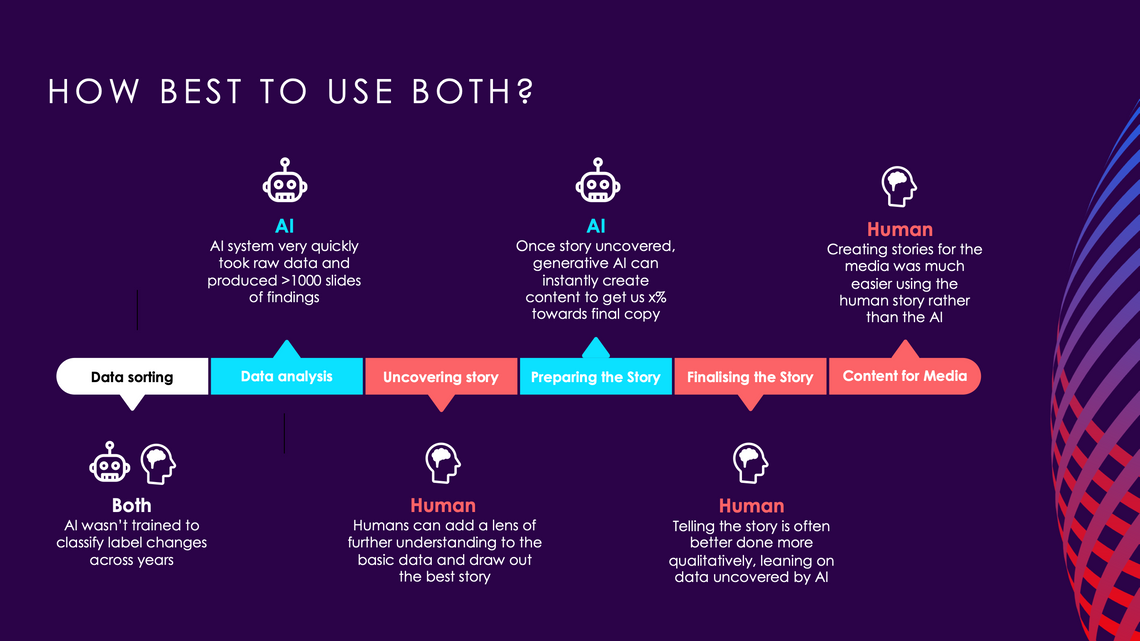 Humans choose data differently from the machine – both in the process and in the content. In terms of process, they put the raw data into spreadsheets and reviewed the data together as a human team in Excel. While time-consuming (at 5-7 hours), this allowed for a detailed analysis of the data, identifying significant patterns and trends without missing the human story behind the numbers. The RedC team then collaborated on a summary of 15 slides, a visually engaging PowerPoint that encapsulated the key story headlines, offering a high-level overview of the most important findings and promoting the WIN data - as per the brief. The human participants' ability to distil complex information into attractive and digestible formats highlighted their talent in storytelling and their commitment to transforming data into creative and powerful narratives.