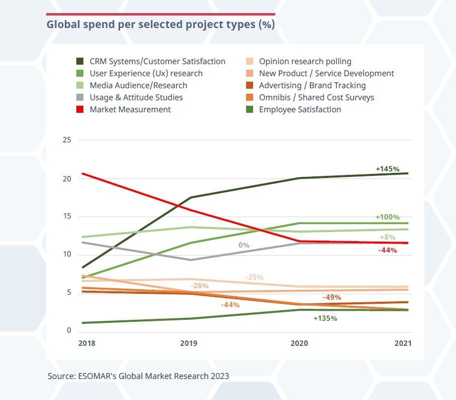 It is interesting to consider customer satisfaction and user experience projects in combination with usage and attitude studies, particularly when looking at their behaviour during 2020 – the latter shows a stable share but monetary growth between 2018 and 2021. The pandemic forced a substantial proportion of the world’s population to adapt to a new reality they had not foreseen, nor had they wished for. This new set of circumstances effectively created an unknown type of consumer that required understanding. Interest in responding to these questions cooled down over 2021 globally, though they still showed the largest growth rates.