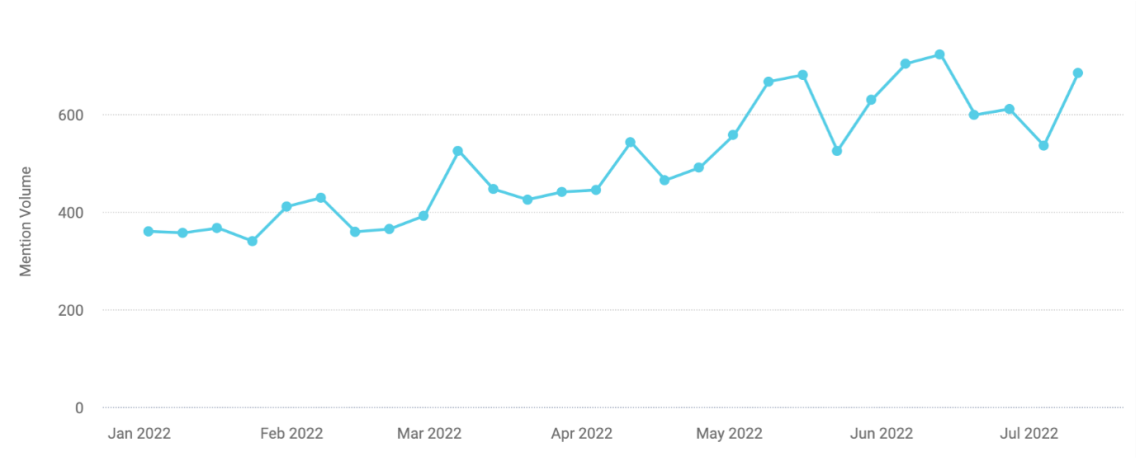 Cost of living concerns The number of mentioned showing concern for the cost-of-living over time. Including terms such as ‘inflation’, ‘can’t afford’, ‘expensive’, ‘fuel prices’ or ‘rising costs’ etc. (sampled data 01.01.22 – 17.07.22)
