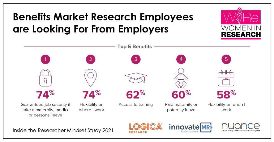 Employees are looking for job security even if leave needs to be taken (74%), flexibility for remote work (74%), access to training (62%), paid maternity/paternity leave (60%), and flexibility around working hours (58%). In a time when many market research firms are struggling to fill open positions and retain employees, it may be time to take a close look at how your company is meeting these most desired employee benefits.